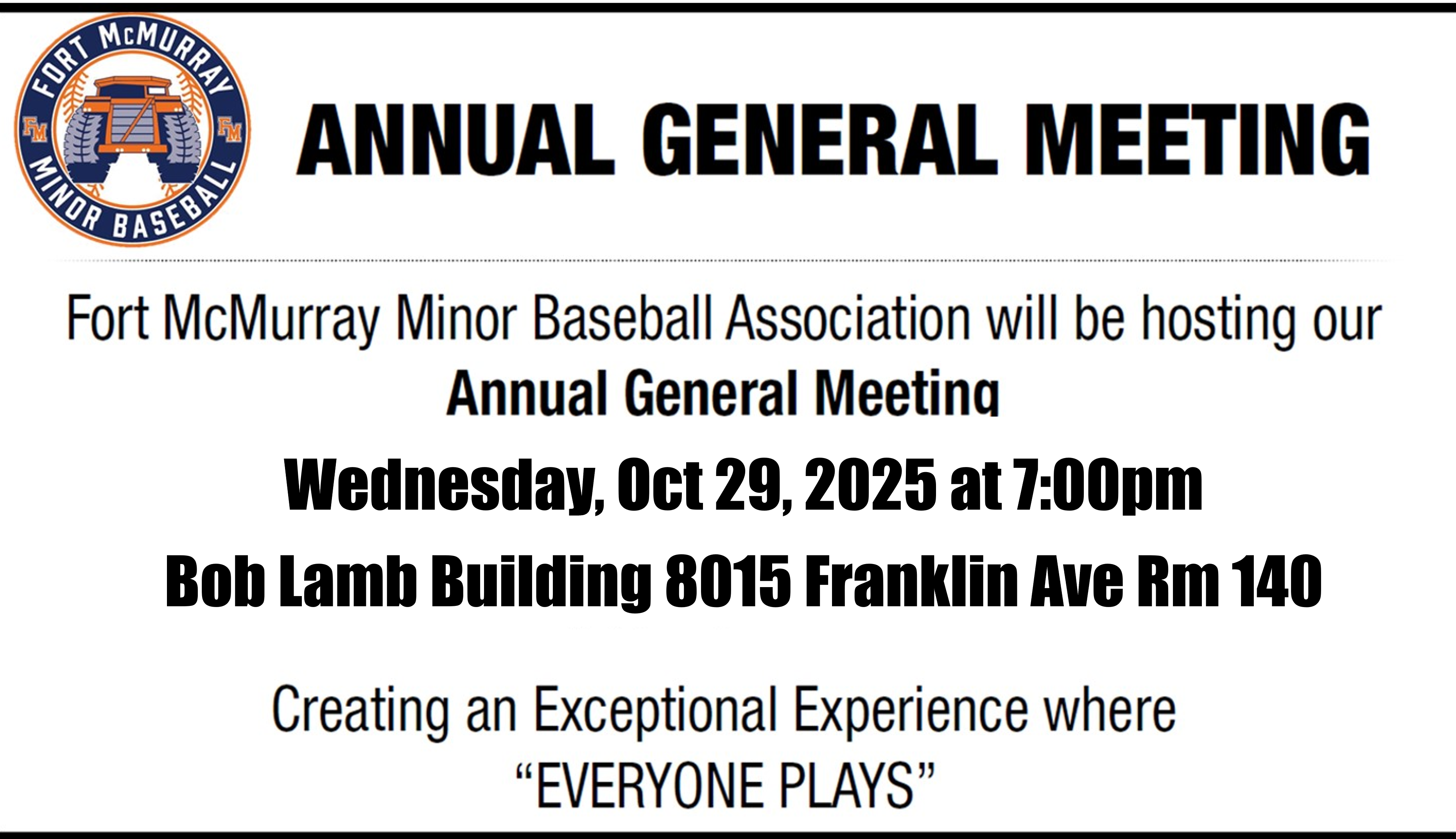 It’s that time of year again! The Fort McMurray Minor Baseball Association (FMMBA) invites all members to attend our Annual General Meeting (AGM) on Wednesday, October 29, 2025, at 7:00 PM. This year’s AGM will be held in person - location to be announced soon!